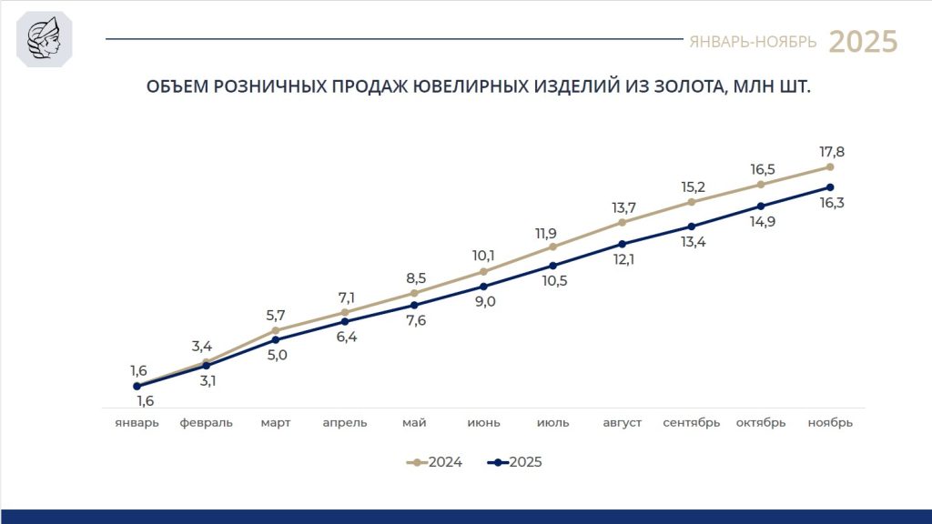 Динамика розничных продаж ювелирных изделий из золота, январь-ноябрь 2025 года