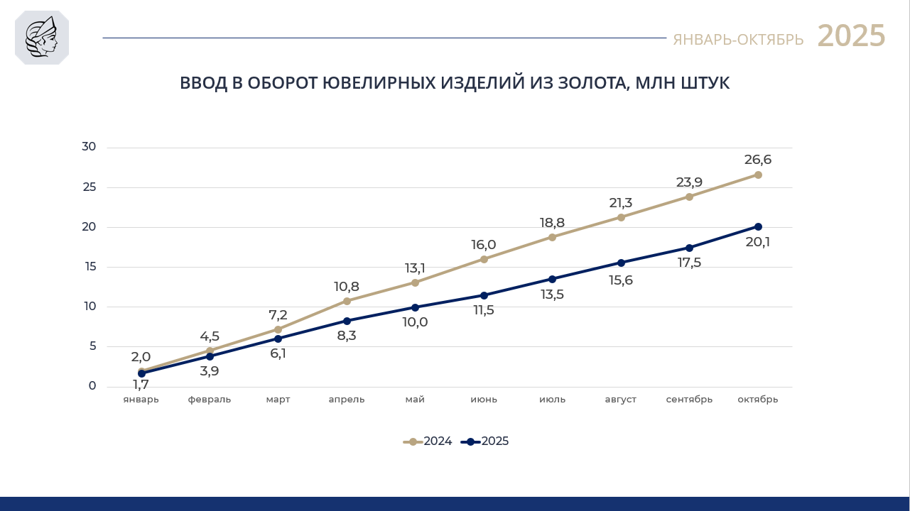 Производство ювелирных изделий из золота, январь-октябрь 2025 года