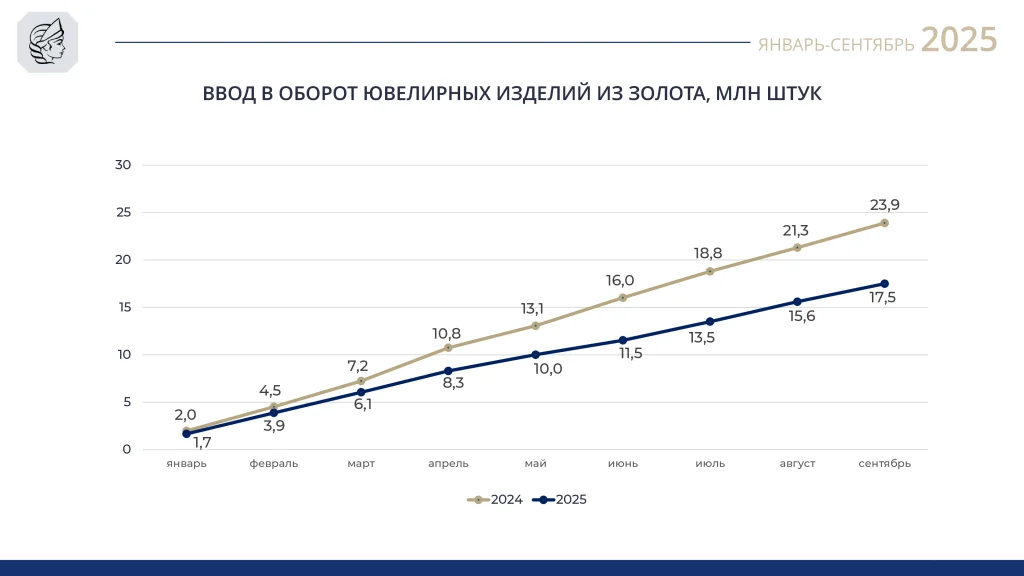 Производство ювелирных изделий из золота, январь-сентябрь 2025 года