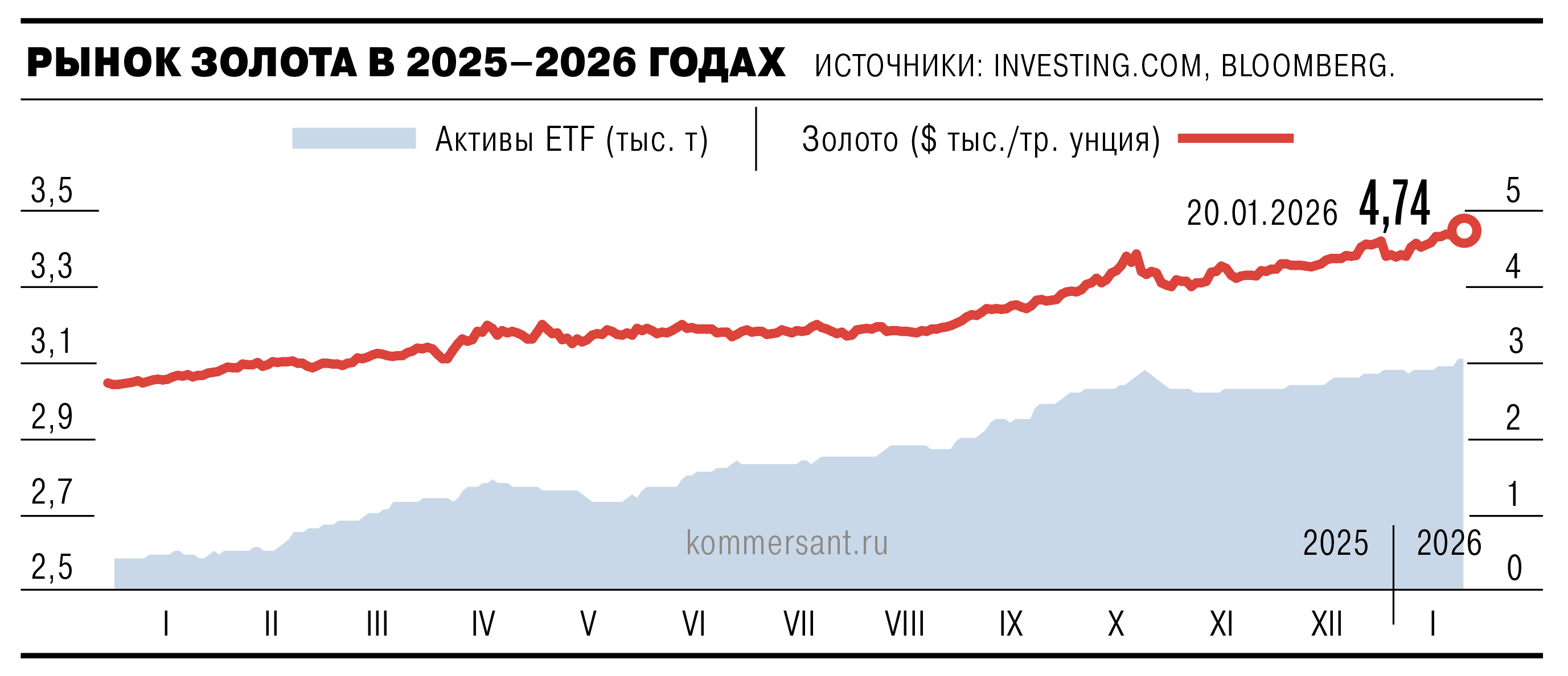 Другие инвесторы также увеличивают вложения в золото. По словам гендиректора сервиса по покупке драгметаллов Moneymatika Максима Мольдерфа, золото воспринимается как нейтральный актив, не связанный с обязательствами конкретных государств и не зависящий от политики регуляторов, и именно этот фактор формирует устойчивый спрос. В результате, по данным агентства Bloomberg, за минувшую неделю активы биржевых фондов, инвестирующих в золото, выросли почти на 29 тонн и впервые с сентября 2022 года поднялись выше 3,1 тыс. тонн. В предыдущий раз активы росли столь высокими темпами в сентябре 2025 года, в ожидании начала цикла снижения ключевой ставки ФРС (см. “Ъ” от 29 сентября 2025 года).