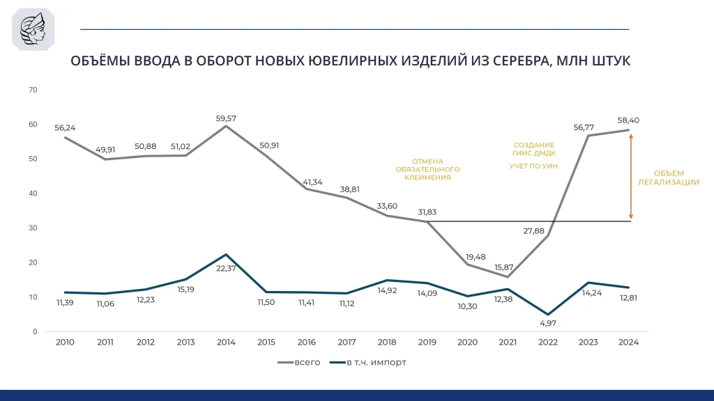 Объёмы ввода в оборот новых ювелирных изделий из серебра с 2010 по 2024 годы