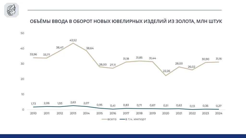 Объёмы ввода в оборот новых ювелирных изделий из золота с 2010 по 2024 годы
